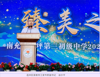 当晚19时,文艺汇演在璀璨灯光中拉开帷幕。高坪区委教育工委、区教体局、安汉教育督导室等相关领导应邀观看演出,高坪区委教育工委专职副书记徐小平发表了热情洋溢的讲话,他肯定了高坪三中近年来在教育教学中取得的优异成绩和“臻美至善,诗意发展”的教育理念,并祝愿艺术节取得圆满成功,高坪三中党总支书记张应龙也在晚会上致辞。