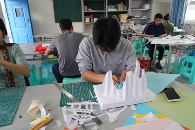 在色彩画命题创作环节,老师们运用水彩、水粉、油画等多种媒介进行独幅创作,调色盘上色彩交织,画纸上光影流动,展现出扎实的造型能力与艺术表现力。手工制作现场,教师们根据命题巧妙构思,运用纸张进行立体造型设计,现场气氛专注而安静,手中纸张在折叠、切割与组合中逐渐呈现出丰富空间与创意形态。
