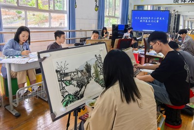电脑海报设计赛场则充满现代气息,键盘与鼠标的操作声中,教师们熟练运用设计软件,将主题视觉化,构图、配色与文字编排展现出新时代美育教师的数字素养与创意视野。中国画人物写生区域墨香弥漫,教师们以笔触勾勒形象,以水墨渲染神韵,在宣纸上传递出中国画的意境与人文情怀。