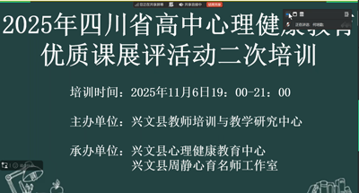 为充分发挥优质课展评活动的示范引领作用,共享前沿教学经验,切实提升全县专(兼)职心理健康教师专业素养,11月6日19:00-21:00,我县以腾讯会议形式组织开展2025年四川省高中心理健康教育优质课展评活动成果二次培训,全县专(兼)职心理健康教育教师参与培训。