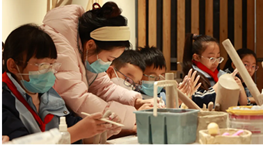 陶艺社团上,陈楠宇老师围绕学校独有的创新陶艺“活动陶胎”,讲授人物身体制作要领,指导学生掌握捏制技巧。