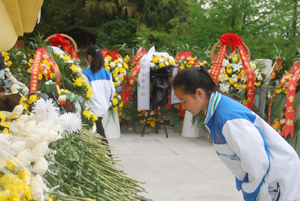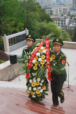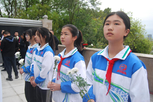 在青松翠柏的映衬下,革命烈士纪念碑显得格外庄严肃穆。团(队)员代表敬献花篮,他们以无限的悲哀,编成洁白的花环,献给敬爱的英烈,告慰英雄的忠魂。接着,全体师生向烈士行三鞠躬礼,以表达深深的敬意和无限的哀思。