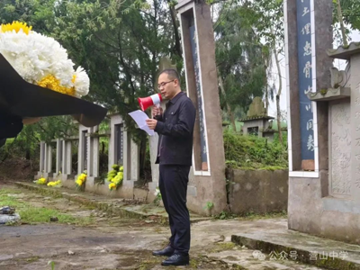 在陵园中,共青团营山中学委员会胡少雄副书记组织大家集体默哀、宣誓、瞻仰烈士碑、敬献鲜花、学习革命先烈故事等方式缅怀先烈,表达永念。