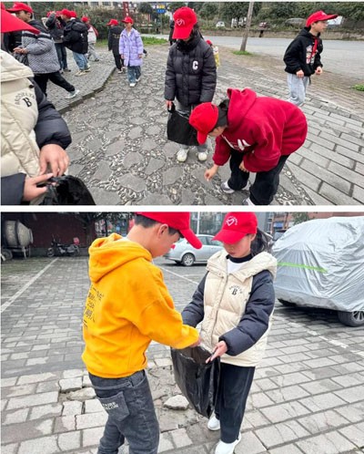 在老师们的带领下同学们戴着志愿帽、拿着垃圾袋,兴奋地踏上了学雷锋的征程。他们穿梭在社区的每一个角落,不放过一片纸屑、一个垃圾,用双手还原社区的清洁与美丽。