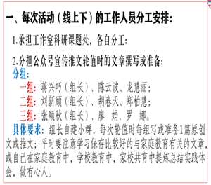 会议伊始,工作站负责人赵华群老师就成员加入“‘家庭教育指导’教学”刘育聪名师工作室内江工作站后,每项每次活动工作人员分工安排进行了总体介绍和说明,如本工作站承担工作室科研课题处工作及各自分工; 轮值公众号宣传推文时的活动工作简报和文章撰写分组安排; 每次站内活动的人员分工安排等。