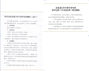 建立健全学校督导制度体系,先后制定了《四川省南充龙门中学教学请假制度》《四川省南充龙门中学教学督导科巡课制度》《四川省南充龙门中学教学纪律(含考试纪律)报告制度》,确保督导各项工作有章可循,有规可依。
