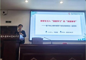 自贡职业技术学校邓丽霞老师作《将学生引入“深度学习”的“深度教学”——基于核心素养背景下项目式教学的一些思考》专题讲座。邓老师分享了对“深度教学”理解,并提出要遵循“五个注重”:注重价值引领,注重问题导向,注重思维培养,注重学科整合, 注重自主探究。