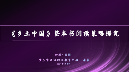 重庆市语文中心组成员、重庆市两江职业教育中心副校长李霞作了《<乡土中国>整本书阅读策略探究》专题讲座。李校长从整本书阅读的价值意义、《乡土中国》整本书阅读的前期准备、《乡土中国》整本书阅读的参考案例等三个方面为大家解读了开展整本书阅读教学必要性,提出了“双线混合五步循序”教学建议, 根据学情,为大家提出“导读--批读--研读--重读”整本书阅读策略。