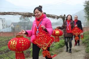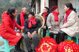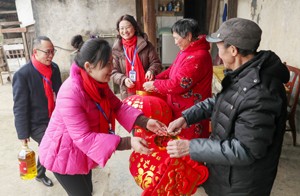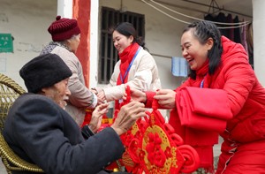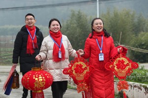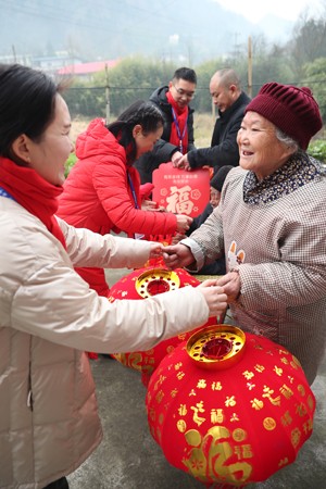 2023年1月11日,四川省广安市社会保险局的工作人员在高寒山区华蓥山红岩乡瓦店村,给从企业退休后生活在这里的唐瑞丰及其家人赠送大红灯笼等节日礼物,祝福他们新年快乐、身体安康。
