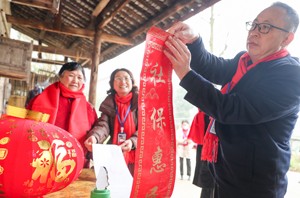 2023年1月11日,四川省广安市社会保险局的工作人员在高寒山区华蓥山红岩乡瓦店村,给从企业退休后生活在这里的袁万权家贴春联,祝福他们新年快乐、身体安康。(邱海鹰)