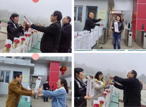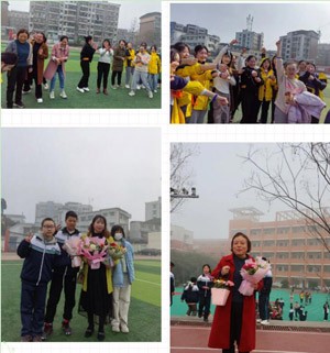 上午8时,校领导在校门口“恭迎”,只为第一时间为女教职工送上节日的鲜花和祝福。