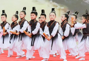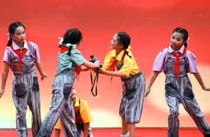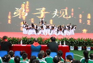 2023年5月31日, 四川省华蓥市双河小学的少先队员在“学习二十大,争做好队员”校园艺术节闭幕汇演暨六一表彰活动上表演歌舞“弟子规”。