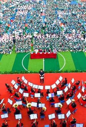 2023年5月31日, 四川省华蓥市双河小学的“娃娃管乐团”在“学习二十大,争做好队员”校园艺术节闭幕汇演暨六一表彰活动上演奏乐曲。(邱海鹰 刘南贤/文图)