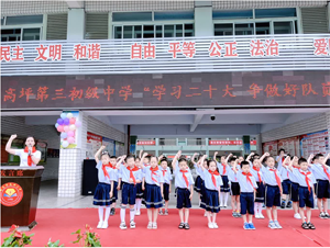 在团委书记兼大队辅导员汤琴老师的带领下,少先队员们举起右拳,在队旗下庄严宣誓:我是中国少年先锋队队员....句句铿锵有力,充分彰显了三中少年作为社会主义事业接班人的信心和决心。他们将以积极乐观、朝气蓬勃的精神面貌,迈着自信的步伐,不断前进!