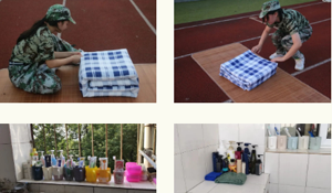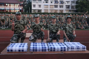 在汇演之前,各参训班级还进行了“叠军被”比赛。各方阵“一”字排开,为精心挑选的各位好手加油助威。随着15分钟倒计时口令的响起,只见选手们迅即就位,手量尺寸、拿捏被角、塑边成线……一系列熟练的压、叠、提、拉的动作过后,一块块“豆腐”终于端上军训的“大餐桌”。总教官还带队检查了各班寝室内务整理情况,现场评出了“星级寝室”。