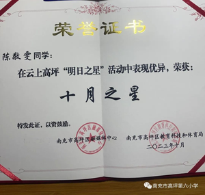 为充分展示学生的艺术魅力,张扬学生的青春活力,彰显学生的精神面貌,丰富学生的校园生活,给学生一个展现自我的舞台,南充市高坪区融媒体中心、南充市高坪区教育科技和体育局在“云上高坪”APP上举办了“明日之星”中小学生才艺展示活动。高坪第六小学学生积极参加,其中,4.2班的陈敬雯同学和3.3班的李佳坤同学同时被评为 “明日之星”活动之“十月之星”!