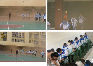 顿时,教学楼硝烟四起,气氛骤紧,广播室同时拉响尖厉的警报声。此刻,教室暂时停电进入停电消防演练环节。在随后撤离疏散环节,同学们听从指令,在各班班主任与相关工作人员的组织下,口捂毛巾,躬身前行,按规定线路紧急、有序地从各个消防通道疏散,与此同时,各安全岗人员在指定位置积极引导学生向安全位置撤离。几分钟后,全校各班全部学生安全、迅速、有序地撤离到了指定点位。