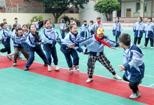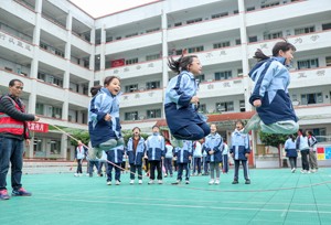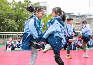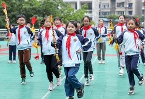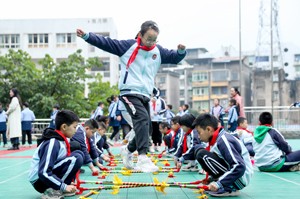 四川省华蓥市双河二小充分利用课间10分钟组织学生到室外参加跳绳、拔河、老鹰捉小鸡等适宜学生玩耍的安全简单的趣味文体活动,让学生调节在课堂上绷紧的神经,缓解学习压力和焦虑,促进身心健康。
