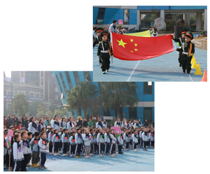升旗仪式正式开始,护旗手们精神饱满,迈着稳健的步伐,高举鲜艳的五星红旗向我们走来。在嘹亮的国歌声中,五星红旗冉冉升起,全体师幼面向国旗,庄严地行注目礼。