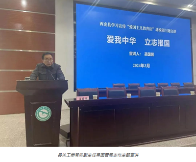 随后,县关工委常务副主任吴国晋作了以《爱我中华 立志报国》为题的主题报告。吴主任围绕爱国主义这一主题,从民族英雄岳飞、两弹元勋钱学森的感人故事,从中国共产党苦难辉煌的历程到新中国的建立,生动诠释了新时代爱国主义内涵,勉励同学们要高举爱国主义旗帜,志存高远,勤奋学习,时刻准备肩负起民族复兴的伟大使命,为实现富强、民主、文明、和谐的社会主义现代化强国而努力奋斗。
