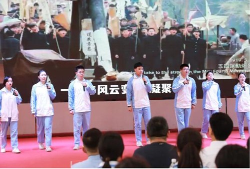 一中学子合唱《倾听百年》。中国青年穿越世界风云,踏上了百年奋斗新征程,实现伟大梦想,中国青年用“乘风好去,长空万里直下看山河”的气魄砥砺奋进;长风破浪会有时,直挂云帆济沧海,中国青年向英雄学习,向前辈学习,向榜样学习,用一份合格的答卷致青春,致祖国!