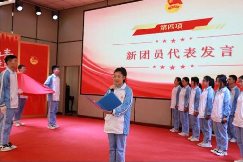 新团员代表张秋湘同学发言。她说:今后将会更加严格地要求自己,遵守团章,规范自己的一言一行,维护团的尊严,保持团的纯洁,树立团的威信。真正做到无愧于祖国、无愧于时代!