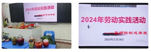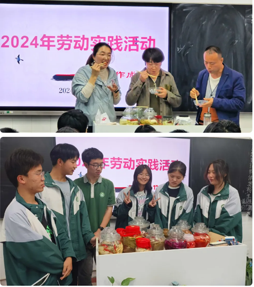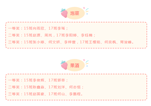 4月17日、5月18日,所有同学将自己制作的泡菜、果酒带到学校,先由班团干部根据成品的色、香、味等进行初评,推荐出优秀作品,最后由教师代表组成的评委终评。获奖情况如下: