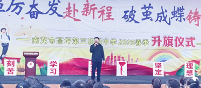 4月1日清晨,高坪三中全体师生齐聚操场,举行“清明祭英烈,传承正当时”主题升旗仪式。在肃穆的氛围中,五星红旗冉冉升起,少先队员敬队礼,全体师生行注目礼,共同致敬用鲜血染红旗帜的革命先烈。