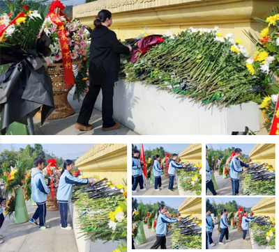 上午9时,祭扫活动在雄壮的国歌声中拉开序幕。师生代表默哀一分钟,深切缅怀先烈,并向烈士纪念碑三鞠躬……随后,他们手持菊花缓步绕行纪念碑,将鲜花轻放于碑前表达追思。