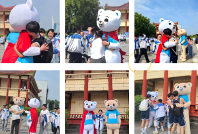 身着萌趣玩偶服的志愿者走入围观同学中间,憨态可掬的样子吸引了同学们纷纷上前拥抱,哪怕日头渐烈,温度升高,志愿者仍然展开双臂,用真诚治愈每一颗孤独的心。一位高三学生坦言:“起初有些害羞,但拥抱的瞬间感受到真诚的温暖,压力仿佛被治愈了。”这一简单却有力的肢体语言,打破了人际隔阂,传递了“拒绝孤独,共享温暖”的理念。