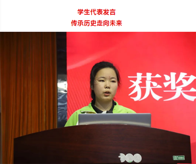 获奖代表熊翌婷同学发表感言。她告诉同学们,完成作品的过程就是一次与历史的对话过程。这次活动让同学们明白传承不是简单复制,而是要让历史在今天焕发出新的活力。