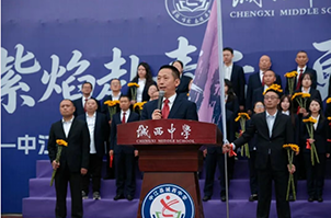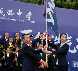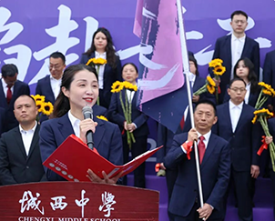 战旗猎猎,初心灼灼。热血与感动交织,战旗交接仪式正式开启。羊崎将承载着城西中学初心与期许的战旗,郑重交到邓艳手中。