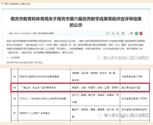 在《南充市教育和体育局关于南充市第六届优秀教学成果等级评定评审结果的公示》中,营山县实验幼儿园的《“爱生命.会生活”园本课程体系》荣获南充市第六届优秀教学成果一等奖!