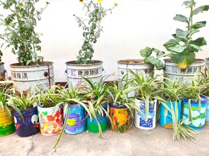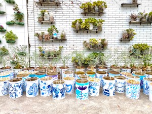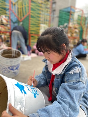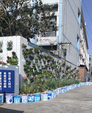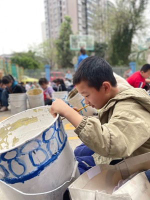 美术社团的孩子大显身手——让柔美高雅的青花瓷与油漆桶碰撞,将操场绿色种植区这道风景线装点得唯美浪漫!