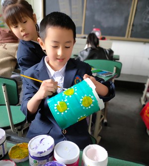 通过前期的宣传活动,教室里收集了很多废旧奶粉罐。在美术老师的指导下,孩子们很快掌握了绘制奶粉罐的步骤。