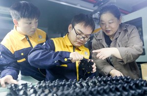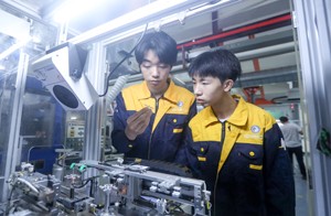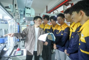 2022年11月9日,四川省华蓥市坤鸿电子厂的技师在设于车间的课堂,给该市职业教育培训中心的学生现场讲解机械的操作技术。