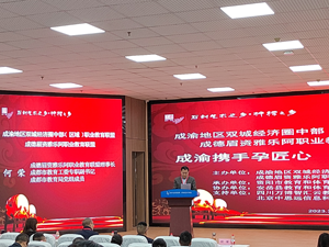 成德眉资雅乐阿职业教育联盟理事长、成都市教育工委专职副书记、成都市教育局党组成员何荣同志代表联盟致辞。他热情地邀请职业学校积极加入联盟,扩大交流。他表示,一直以来,联盟都通过标准共研、平台共用、资源共享和中高职衔接等途径,凝聚合力,统筹资源,优化职业教育类型定位,扎实推动其协同发展。他希望,与会诸君能以德育工作这一战略工程、固本工程、铸魂工程为抓手,把住“西部大开发”“一带一路”“成渝双城经济圈”“数字经济”等时代发展脉搏,围绕“西部经济中心”“农业建设带”等新的平台和机遇,发挥“长板效应”,联通政校企研,构建大格局,创建新机制,拔节孕穗,推动育人成果的落地落实。