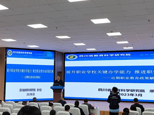 开幕式后,四川省教育科学研究院职业教育与成人教育研究所所长廖大凯作了《提升职业学校关键办学能力 推进职业教育高质量发展——近期职业教育政策解读》的专题讲座。廖所长以终为始,首先对“职业教育高质量发展”进行了政策溯源,然后条分缕析地介绍了“职业教育高质量发展”的目标、原则与体系建设,最后自然引出“提升职业学校关键办学能力”——“把牢立德树人根本方向,建立建全‘三全育人’体系;对标区域经济,动态调整专业,创新人才培养模式;对接‘新方法、新技术、新工艺、新标准’,开发新课程,扩大优质教学资源共享;深入推进人才强校战略,打造名匠大师领衔的高水平‘双师型’师资队伍;加快学校数字化转型,努力建设西部一流、全国领先的职业学校;打造高水平的社会服务体系,着力提高服务行业发展、产业升级和民生幸福的贡献度”的解读。