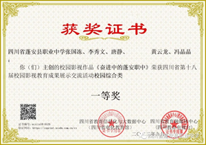 近期由四川省教育融媒体中心(四川教育电视台)、四川省教育信息化与大数据中心(四川省电化教育馆)联合举办的四川省第十八届校园影视教育成果展示交流活动,经过评审组公正、严谨的评审,四川省蓬安县职业中学影视作品《奋进中的蓬安职中》荣获校园综合类一等奖,《文明点滴在身边》荣获校园电视公益广告类二等奖。