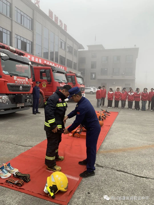 消防员战士为同学们介绍了部分消防救援专业器材工具使用以及展示了灭火战斗服、抢险救援服的作用并且让同学们穿戴体验。