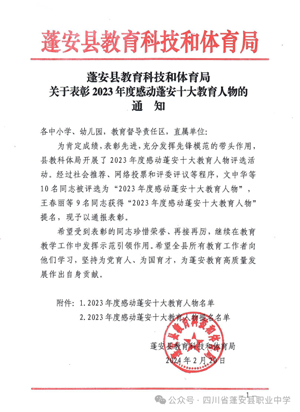由蓬安县教育科技和体育局组织开展的2023年度感动蓬安十大教育人物评选活动,经过社会推荐、网络投票和评委评议等程序,四川省蓬安职业中学教师胡良春被评选为“2023年度感动蓬安十大教育人物”。