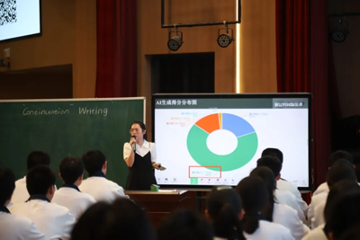 活动开篇,英语组王娟老师带来AI融合创新示范课。她以英语读后续写为教学载体,让在场教师直观感受到AI技术在学科教学中的实用价值。课堂上,王老师借助AI工具构建了“精准诊断—智能优化—靶向提升”的教学闭环,通过AI系统对学生的读后续写作业进行自动化评分,快速生成包含语法错误、逻辑衔接、内容创意等维度的详细分析报告;随后针对学生写作中的共性问题,利用AI功能生成个性化修改建议;最后结合AI反馈的薄弱知识点,设计针对性练习,帮助学生精准突破学习瓶颈。整个教学过程逻辑清晰、实操性强,为不同学科教师如何将AI融入日常教学提供了可复制、可推广的鲜活范例,赢得了现场教师的广泛认可。