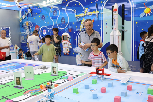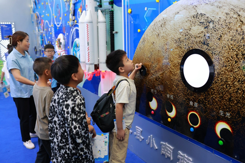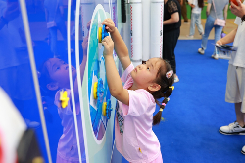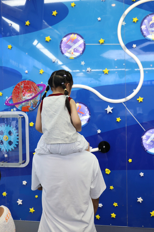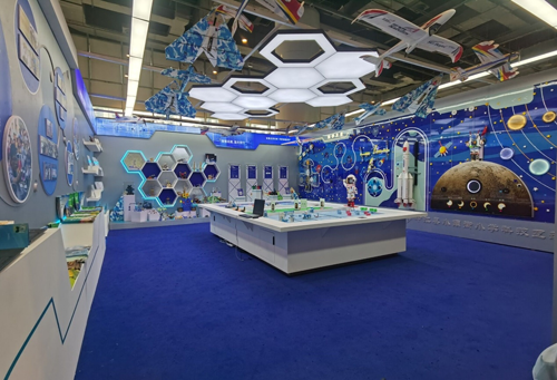 三是科技互动体验区。这是由天宫一号、神州发展史、火箭发射、着陆月球、八大行星组合而成的。它是一个可操作、可视听的科技互动体验墙,让孩子们近距离感受宇宙的奥秘,体验太空探索的乐趣。