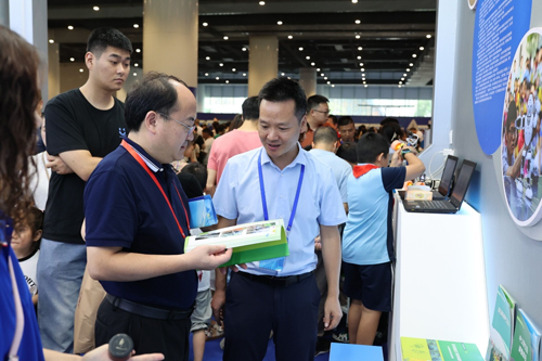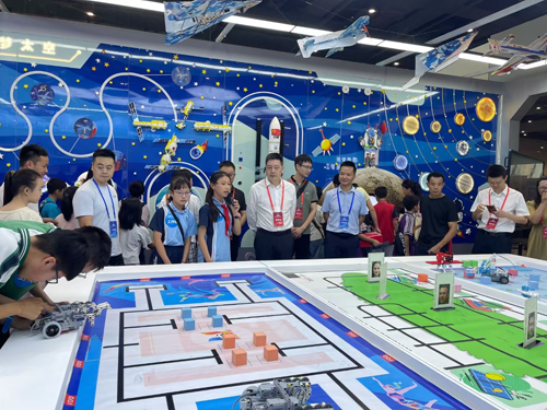 四是创新项目展示区。这里主要展示了三个学校的创新项目:中江县小南街小学校的“数据风暴”,操作者需要根据任务需求,编写程序代码块,下载到机器人,然后执行。中江县广福中学校展示的是ENJOYAI火星探险家挑战。中江县继光实验学校展示的是挑战Super AI超级轨迹虚拟机器人。