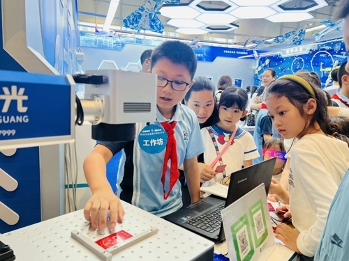 工作坊的顶面悬挂的是孩子们动手实践的航模,门口展示的激光雕刻,几秒钟就可以雕刻出想要的图片或文字。给自己定制一张个性化名片的活动现场异常火爆!