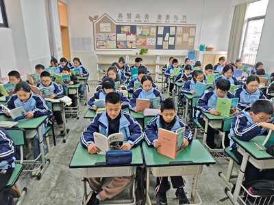 中午,随着“书卷有味,阅读有光。用文字启迪智慧,用经典浸润心灵。同学们,让我们一起翻开书,读经典、读世界、读自己。”的铃声提示,全校师生就积极地投入到阅读活动中。孩子们全神贯注地阅读着,老师们也和学生一起,静心翻看手中的书籍,整个校园都沉浸在静谧的书香中。