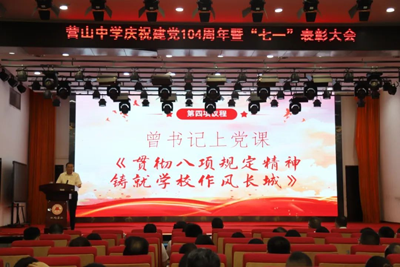 6月30日晚,四川省营山中学校党委在天伟会堂隆重召开庆祝建党 104 周年暨“七一”表彰大会,党委书记曾振宇同志讲授学习贯彻中央八项规定精神专题党课。