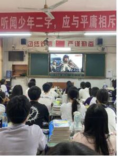 上午9时,活动正式开始。在70分钟的阅兵仪式中,师生们全程肃穆,凝神屏息。当礼炮轰鸣、国旗升起,官兵高呼强军口号时,会场响起热烈掌声;当徒步方队迈着铿锵步伐通过天安门广场,展现“一老一新”武装力量体系时,师生们为军队的威武雄壮而自豪;当装备方队展示500余台国产现役装备,包括高超音速武器、新型隐身战机等“大国重器”时,科技楼阶梯会议室和教室中惊叹连连。联合军乐团演奏的《松花江上》《保卫黄河》等抗战经典乐曲,将师生带回烽火岁月,而新时代强军乐曲则激荡着大家对未来的憧憬。