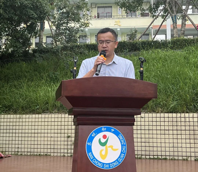 东观初中校长、党支部书记杨军为开学典礼致辞,杨校长先是代表学校对全体同学和家长表示热烈的欢迎,然后回顾了在过去一学期里,学校基础设施、校园风气和办学成果取得的可喜变化和骄人成绩。
