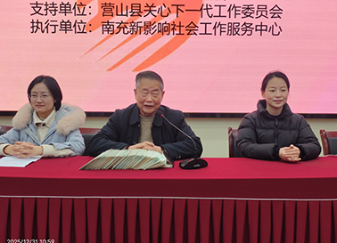 2025年12月31日,营山县关工委、南充新影响社会工作部在营山中学科技大楼为100名留守女生举办中国儿童少年基金会“春蕾陪伴”公益项目助学金发放仪式,每名受助学生获得1200元人民币。县关工委常务副主任宁幼康出席并讲话。